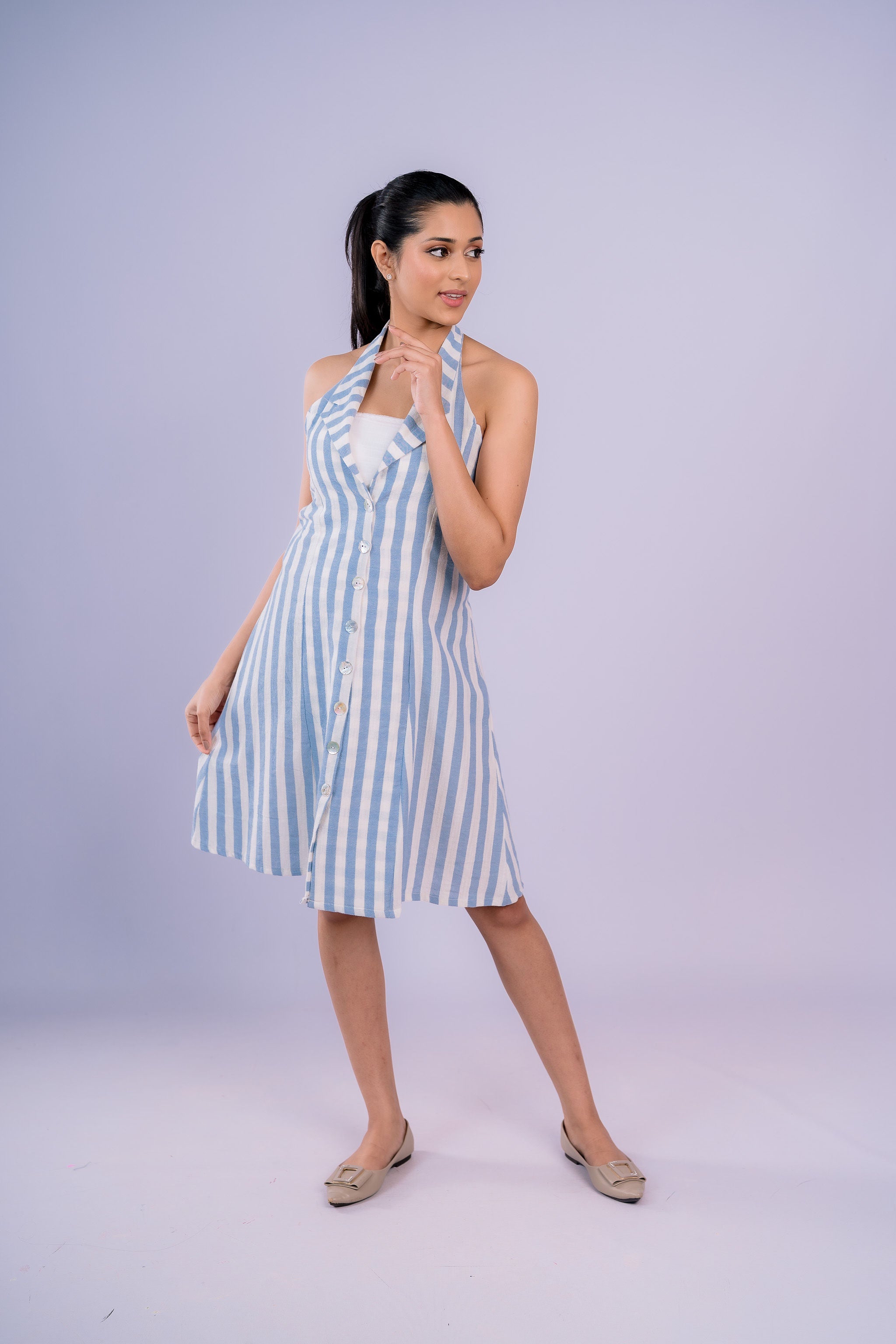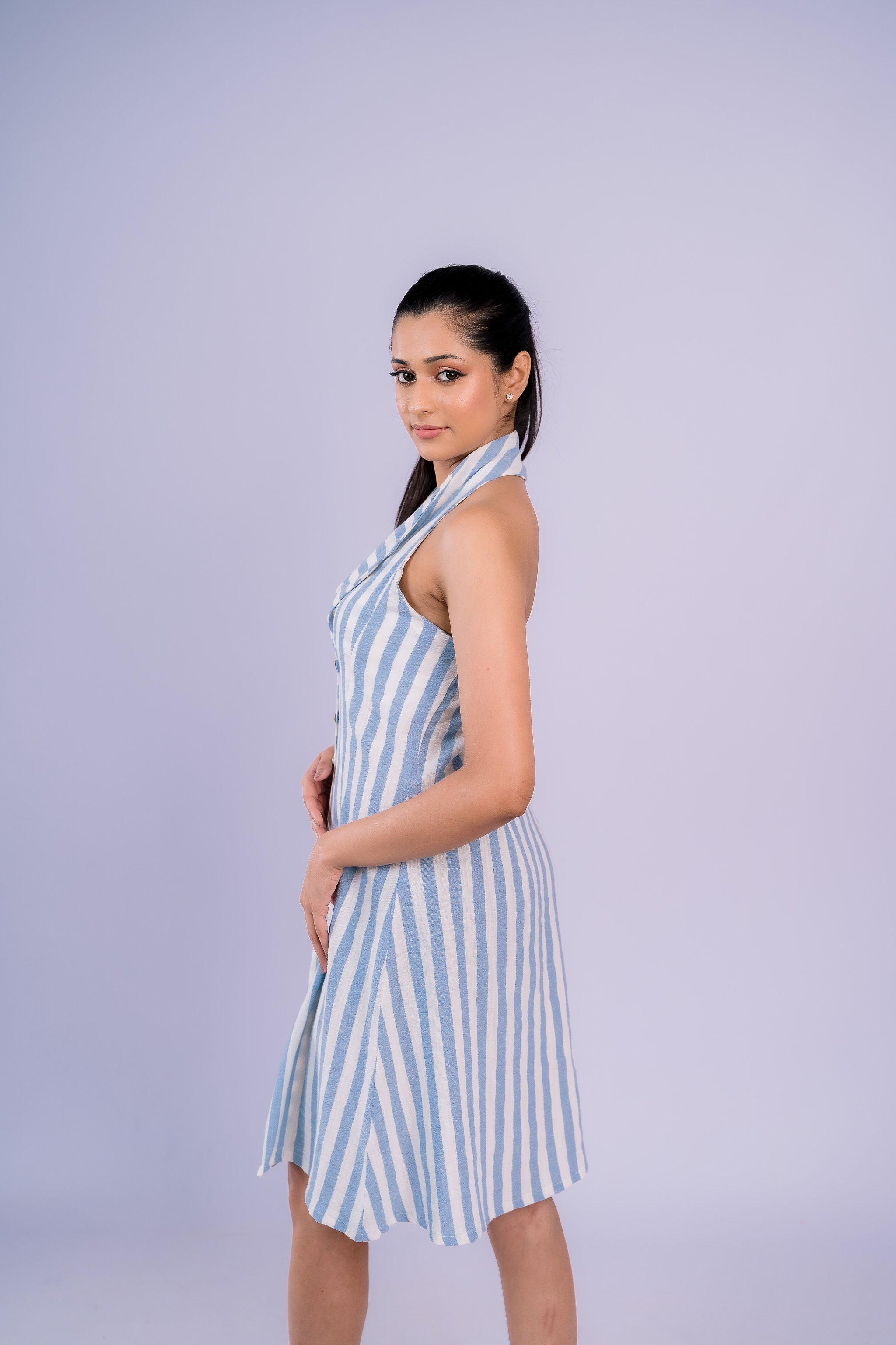 Fresh and effortless, the Halter Day Dress features a flattering halter neckline paired with classic white and blue vertical stripes. Designed to create a clean, elongated look, this frock is perfect for warm days and easy outings. The lightweight feel and relaxed silhouette make it comfortable to wear all day, while the striped pattern adds a timeless, summery charm. Ideal for casual lunches, day events, or weekend strolls, this dress is an easy go-to for a polished yet laid-back style.
